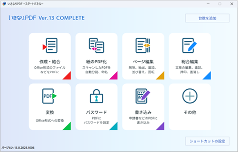 「いきなりPDF」の特長である“スタートパネル”を、より見やすく、使いやすくしました。よく使う機能をアプリケーションごとにまとめて表示し、目的の操作をすぐ見つけられます。これまで通り、アプリケーションごとにショートカットを作成することも可能です。