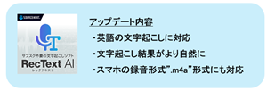【 「RecText AI」のアップデート内容 】 ■英語の文字起こしに対応 日本語に加え、英語の文字起こしも可能になりました。これにより、グローバルな会議の議事録作成や海外ニュースのテキスト化など、幅広いシーンでご利用いただけます。 |