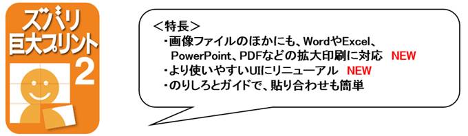 ソースネクスト株式会社(本社:東京都港区東新橋1-5-2 汐留シティセンター33階 代表取締役社長:松田 憲幸)は、4月18日(火)に、家庭用のA4プリンタで大きなものを印刷できるソフト「ズバリ巨大プリント 2」(3,990円・税別、ダウンロード版)を弊社サイト上で発売いたします。本製品は、2003年に発売したロングセラーシリーズの最新作で、画像以外のファイルの巨大化や、縁なし印刷に対応するなどのバージョンアップにより、さらに使いやすくなりました。