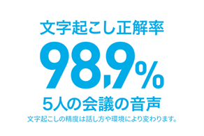 文字起こし正解率98.9%の数値(1回の検証)は、環境音が約40dbの会議室で、話者と端末との距離が50cmで5名(うち2名はリモート参加のためスピーカーからの距離)の会話を録音してテキスト化。 (ソースネクスト調べ/2023年8月)。 |