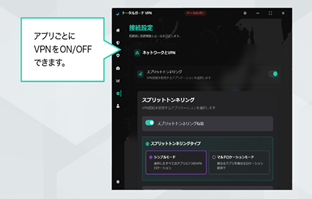 従来のVPNでは、すべての通信が暗号化サーバーを経由するため、通信速度が低下する課題がありました。複数のアプリを開くほど動作が重くなり、動画ストリーミングやゲームの利用が困難になります。 「トータルガードVPN」は、独自技術により通信速度の低下を最小限に抑え、スプリットトンネリング機能で必要なアプリだけをVPN経由にできます。たとえば、オンラインバンキングやショッピングアプリは強力な暗号化で保護しながら、動画ストリーミングやゲームは最速で楽しむ。この使い分けにより、セキュリティと快適さを同時に実現します。 |